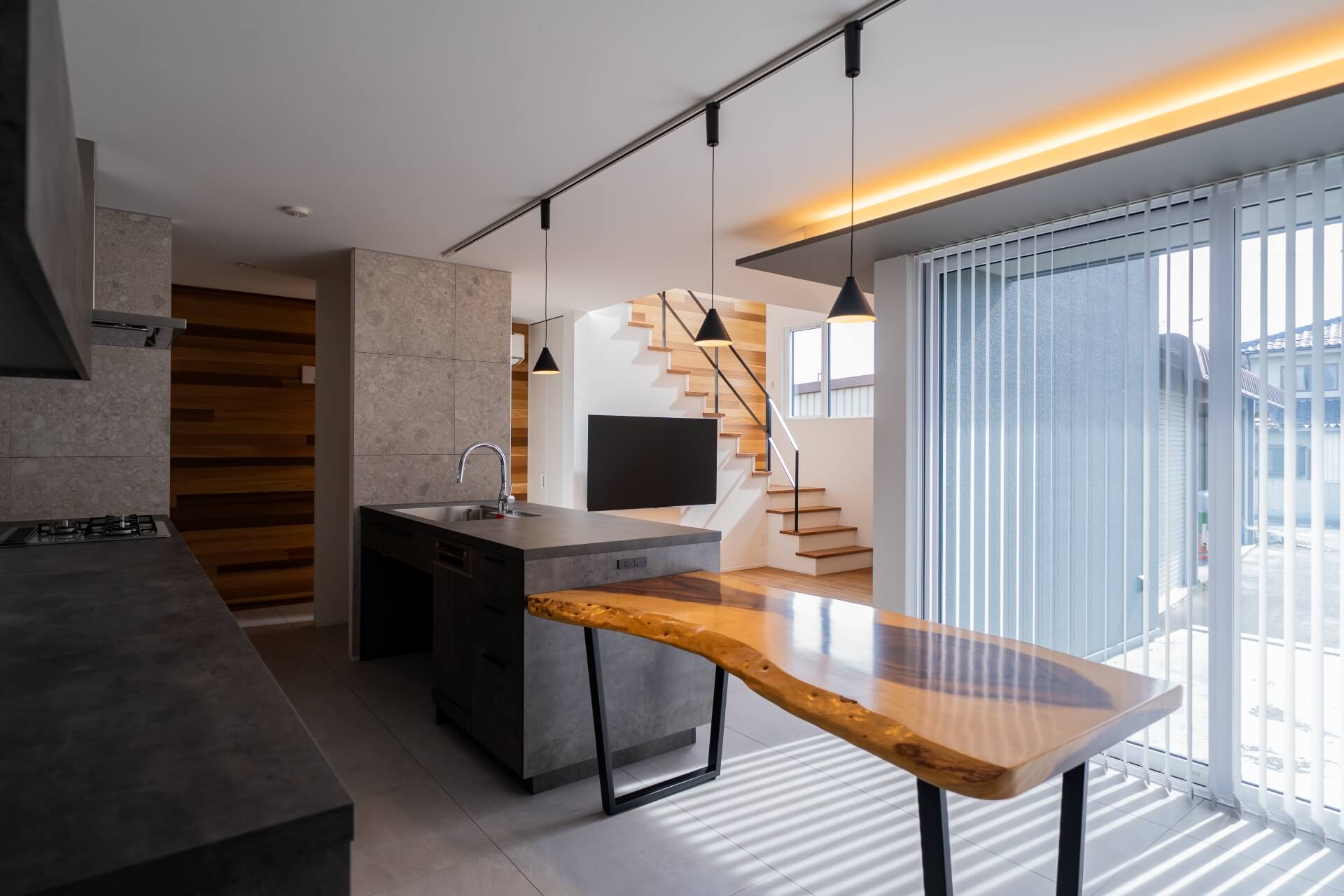 無機質な空間にモンキーポッドの一枚板のダイニングテーブルが合う!