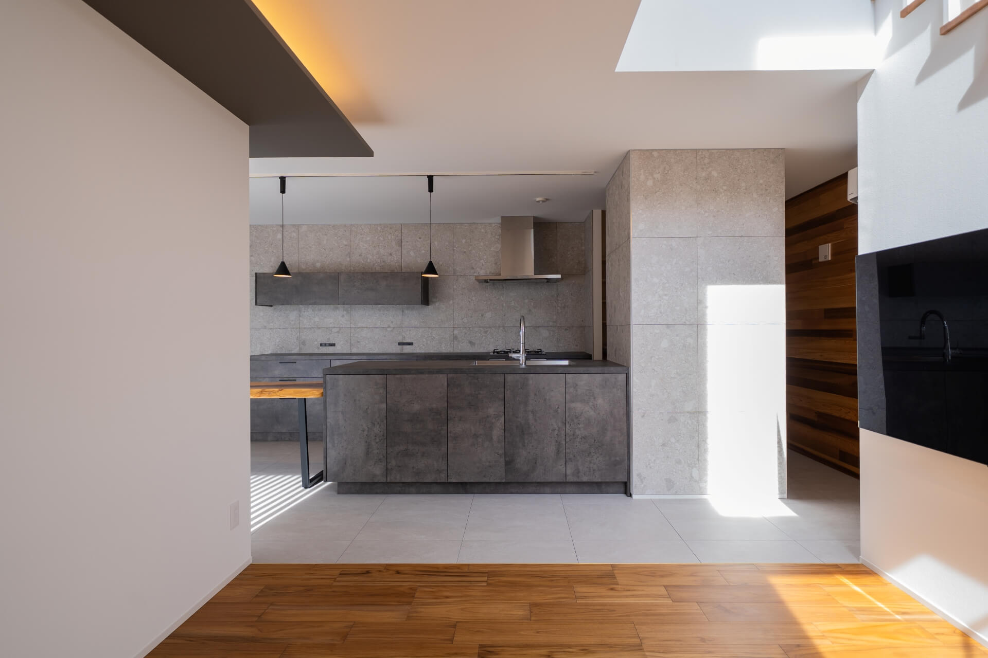 階段とキッチンとタイルとレッドシダーの感じもgood!