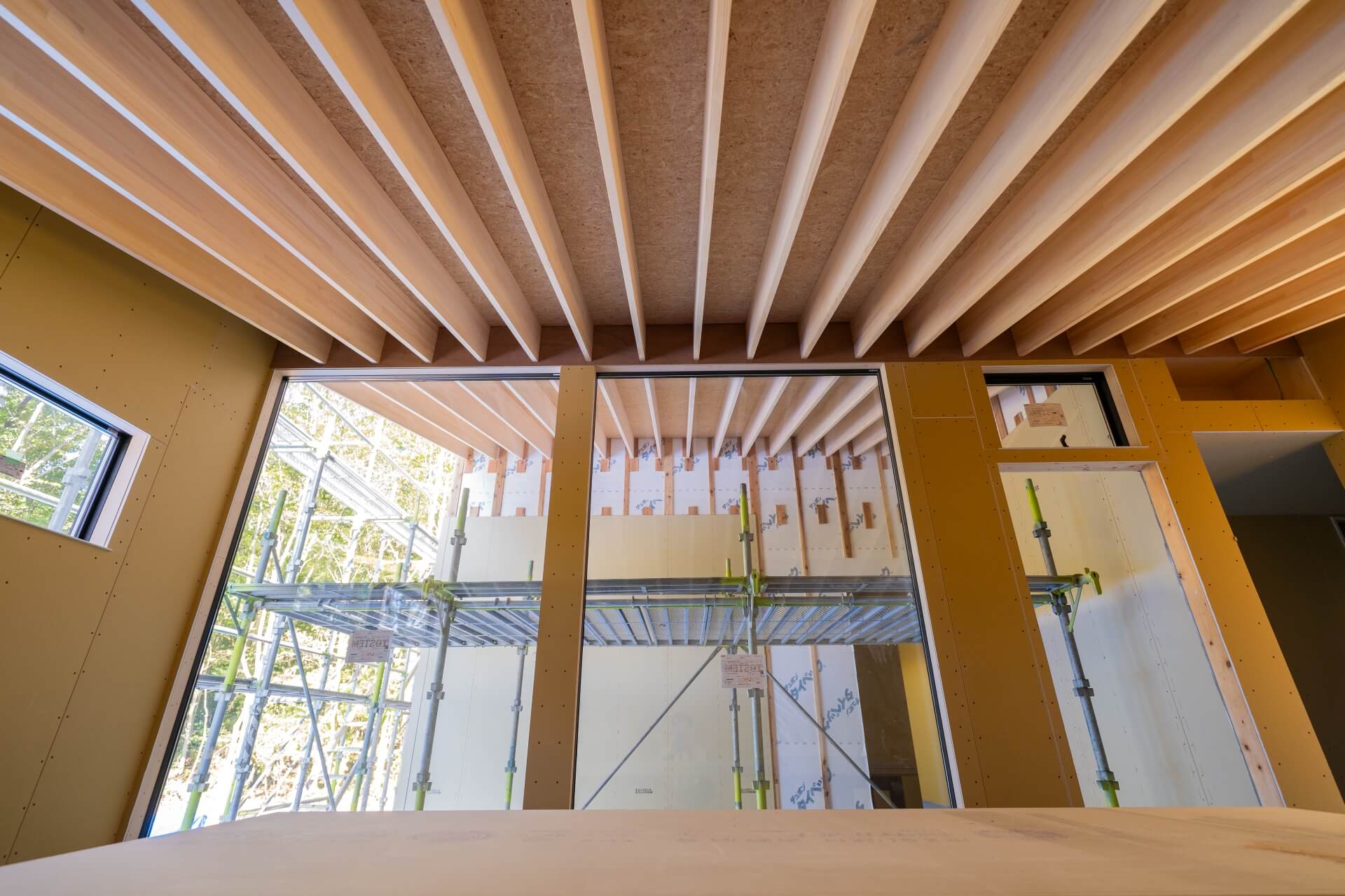 窓はまだ付いていませんが、窓枠の向こうに広がる素敵な緑の借景!狙い通り!!
